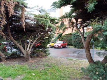 Vykácení keřů (Juniperus) – staré, proschlé, neudržované keře, zasahující do chodníku, omezující volný průchod, bránící výhledu chodců i řidičů u přechodu pro chodce, zakrývající dopravní značení.